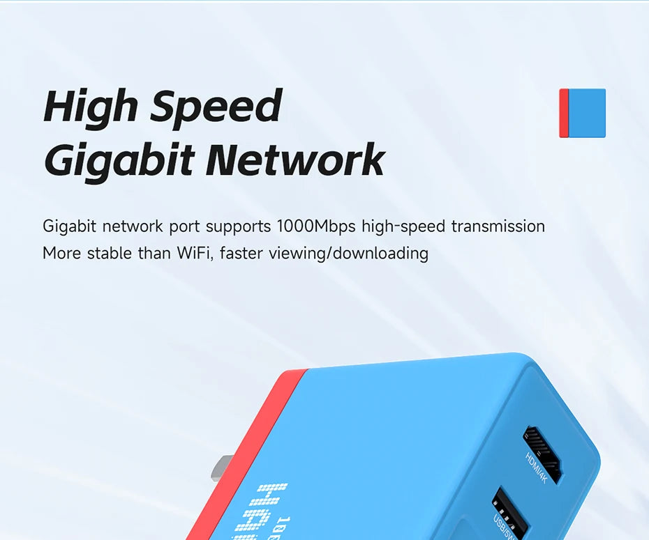 The gigabit network interface supports 1000Mbps high-speed transmission, which is more stable than WiFi and faster for viewing/downloading