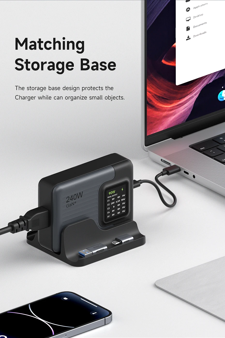 5 in 1 Charging Station with LCD Display: This USB C charger is able to charge 5 devices perfectly at the same time.(laptop, tablet, phones and earphone) When using all ports together, the charging station provides maximum C1(100W)+C2(65W)+C3(45W)+(C4+USB1)15W power. And the LCD display shows the current data of each port in real time.