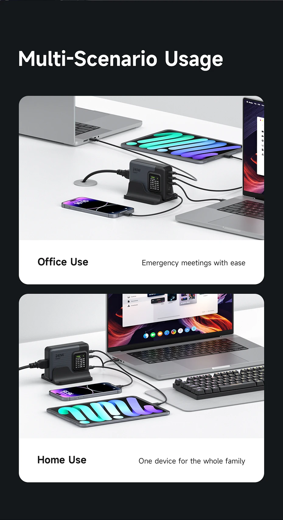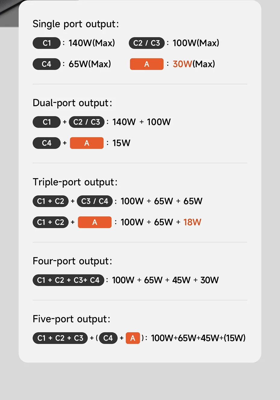 High Power 240W USB C Charger: Improve Efficiency! C1 port keeps providing a maximum 140W to charge laptops at high speed. When only using 2 USB-C ports together (C1+C2/C3), the charger provides maximum 140W+100W fast charging power for two laptops at the same time.