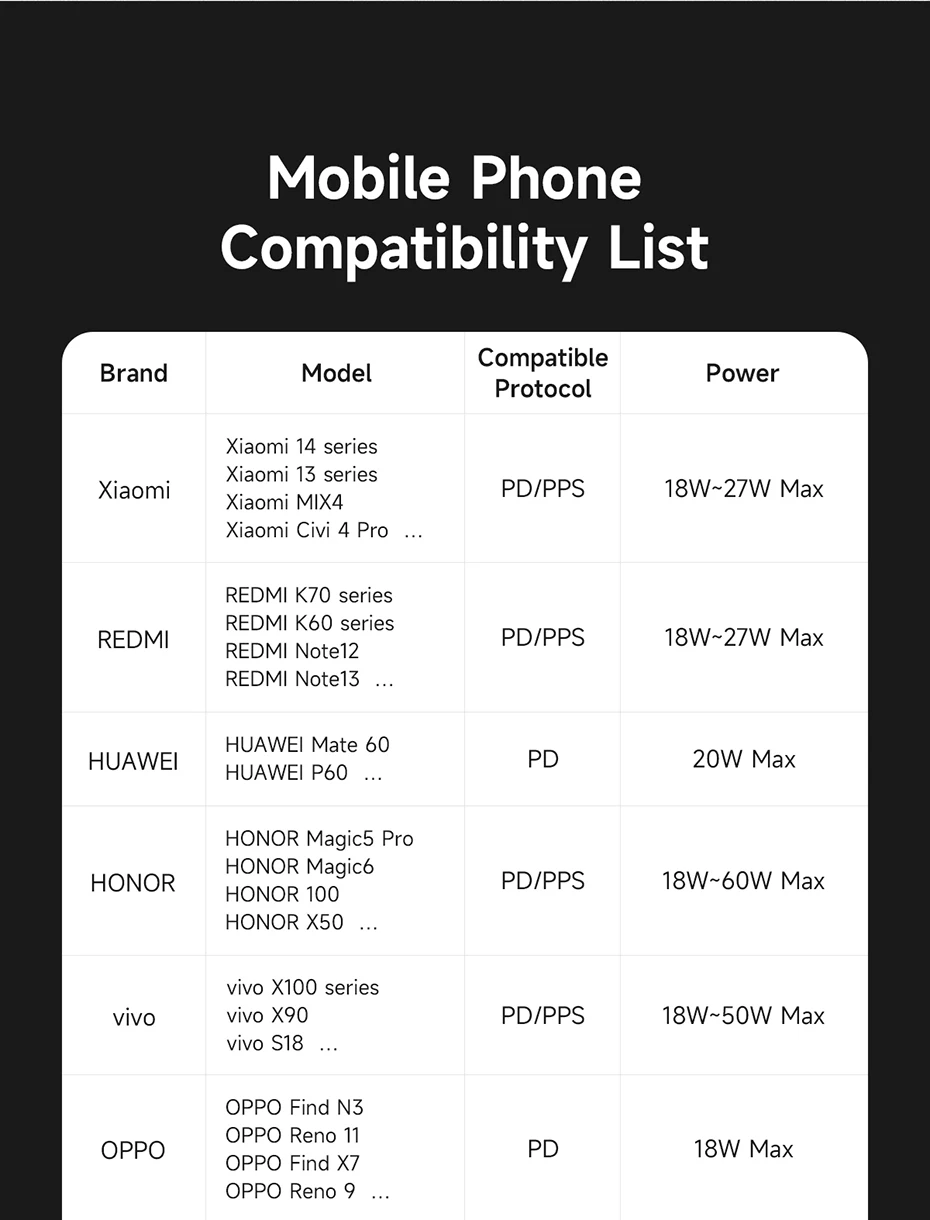 Multi-protocol compatibility: Support PD3.1/3.0/2.0 fast charging protocol; support FCP, SCP protocol; support Apple 2.4A fast charging protocol; support PPS protocol; also support switch TV mode and ROG 30W turbo mode(C2/C3/C4).