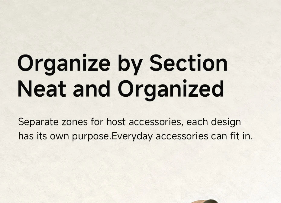 Organize by section Neat and organized:Separate zones for host accessories, each design has its own purpose.Daily accessories can fit in