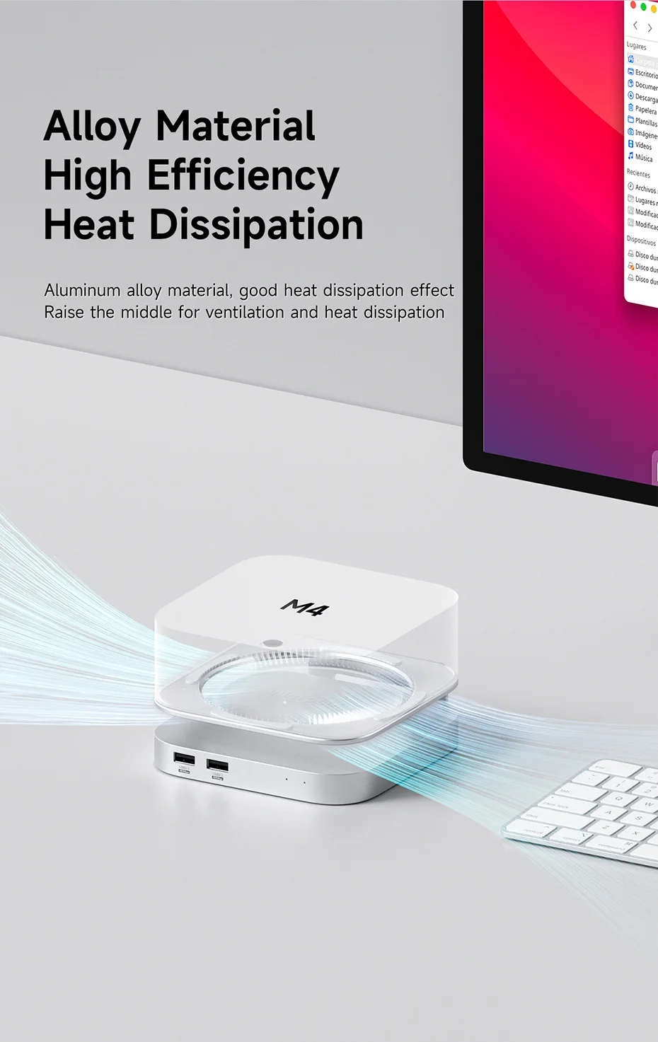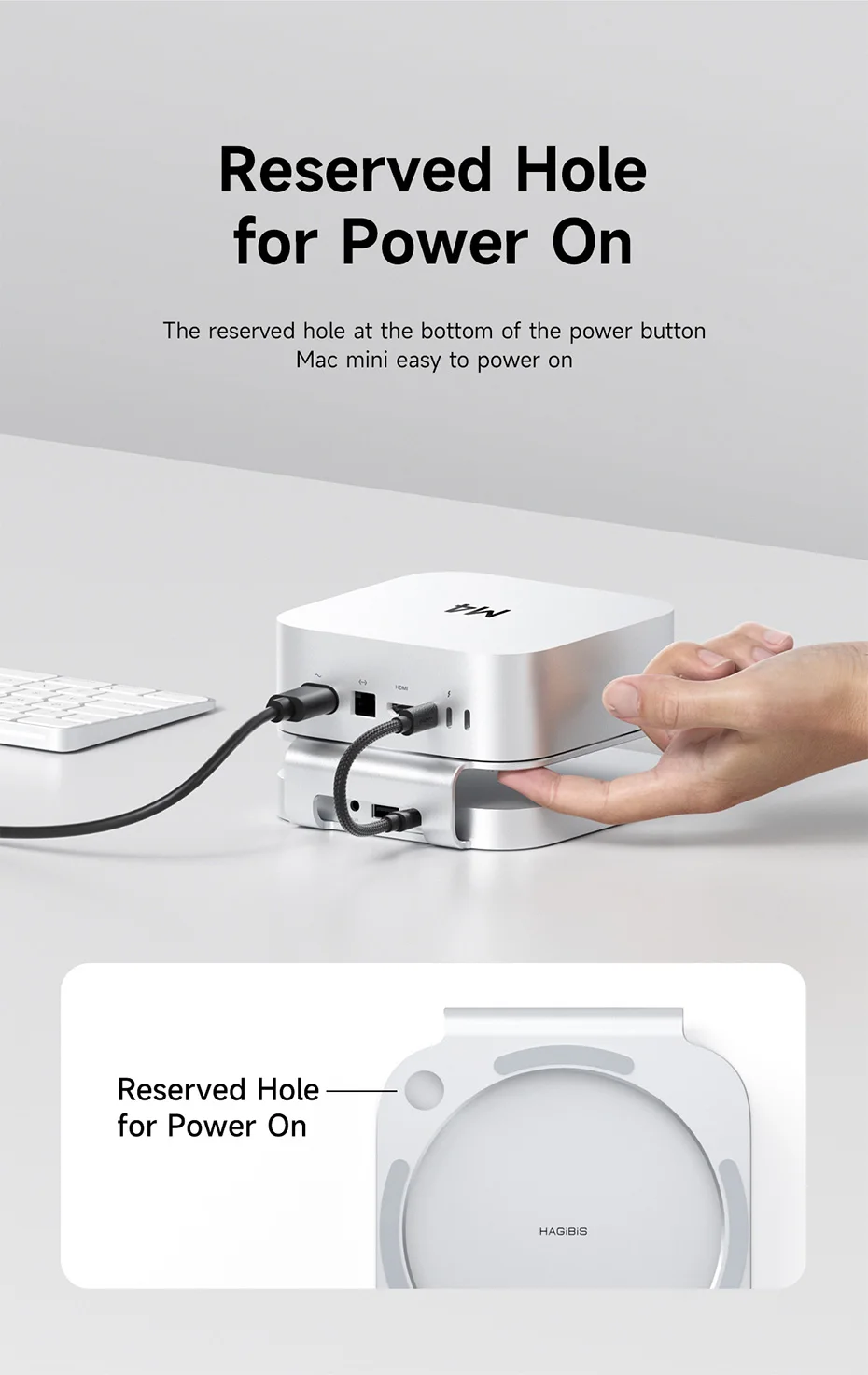 High Efficiency Heat Dissipation: This Stand has aluminum alloy material which has good heat dissipation effect. And raise the middle design fot better ventilation and heat dissipation. *Note: We have reserved a Mac Mini M4/M4 Pro power on hole in the stand for easy users to power on the Mac Mini M4/M4 Pro at the bottom